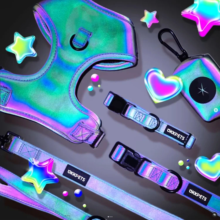 Reflective & Iridescent Dog Harness And Leash 4 piece Set
