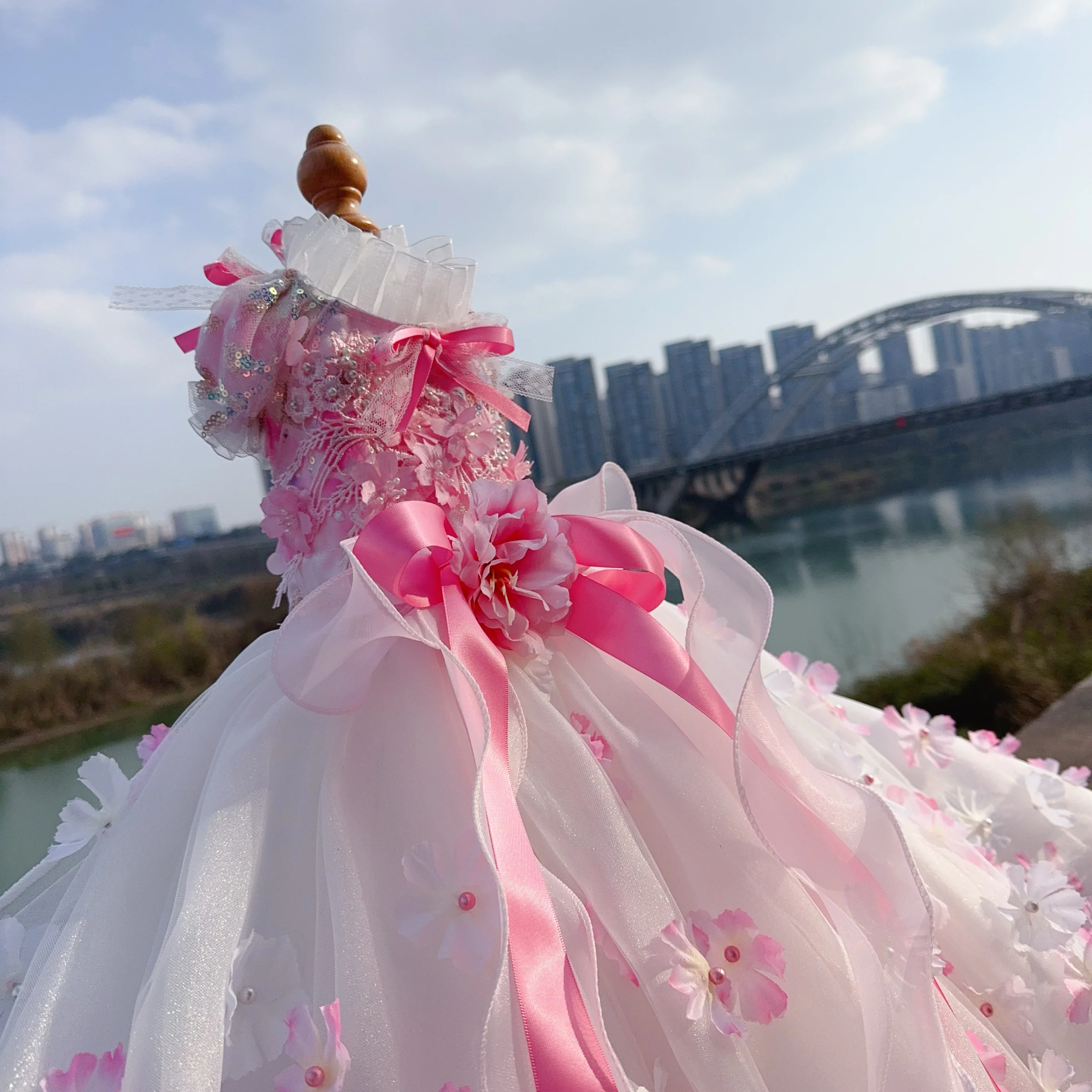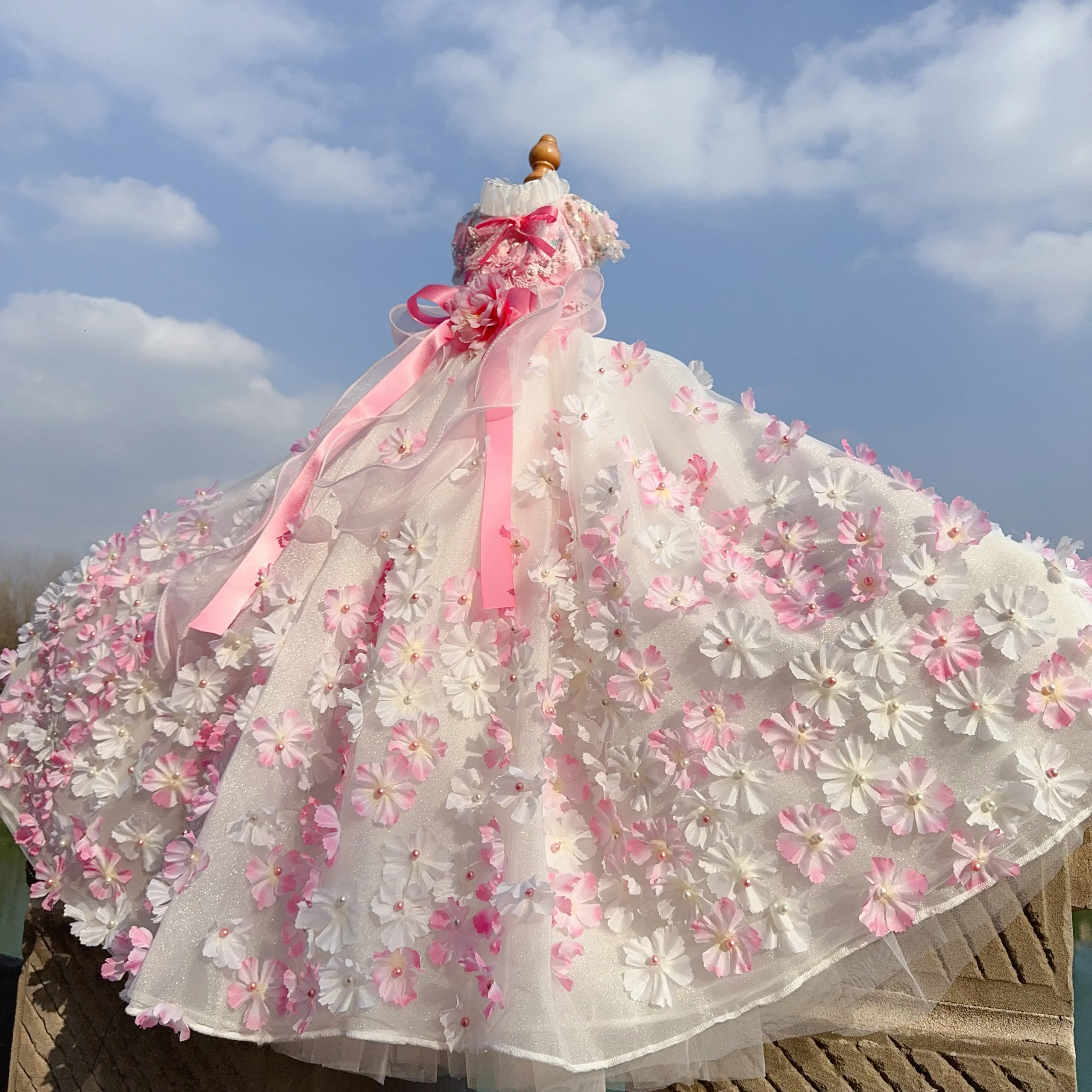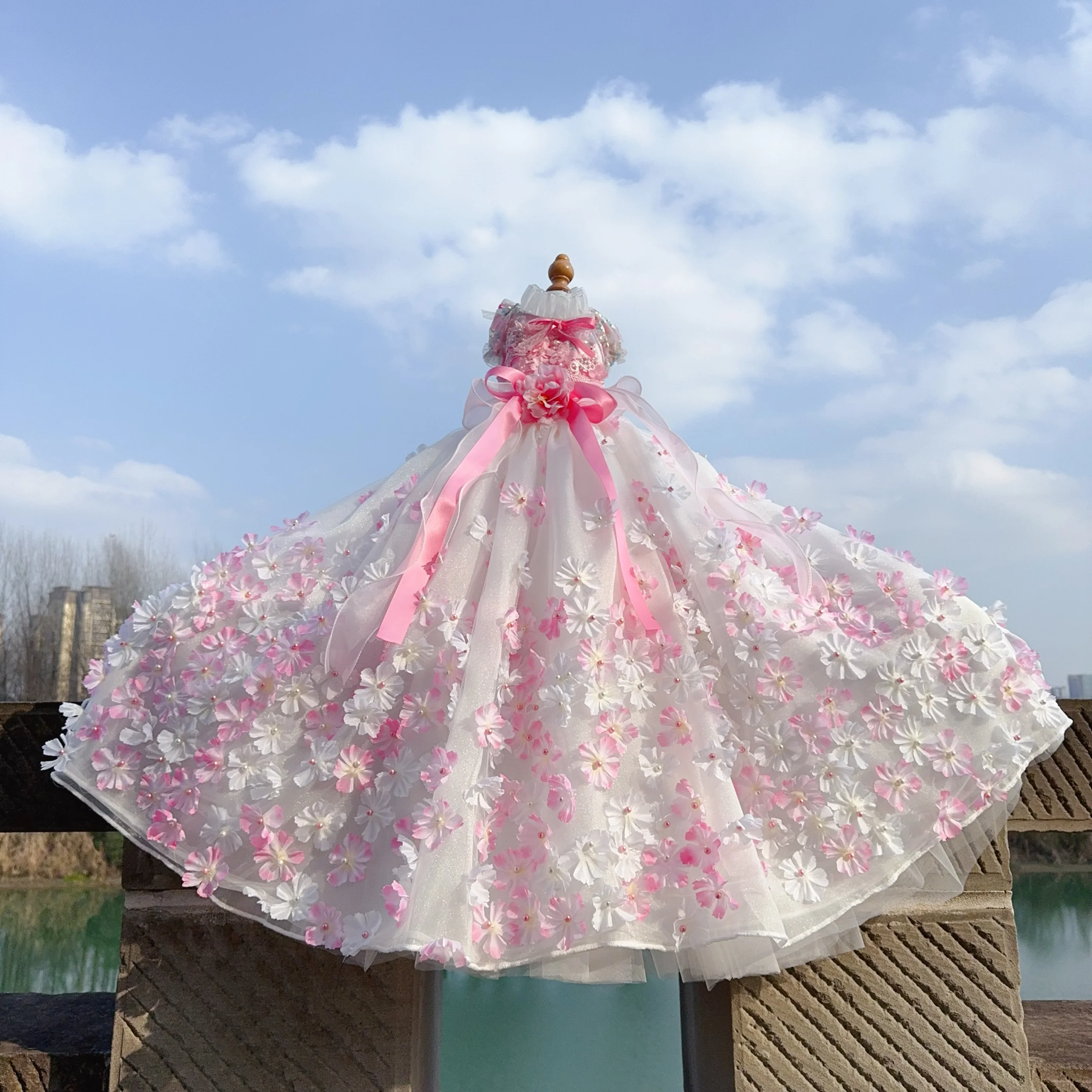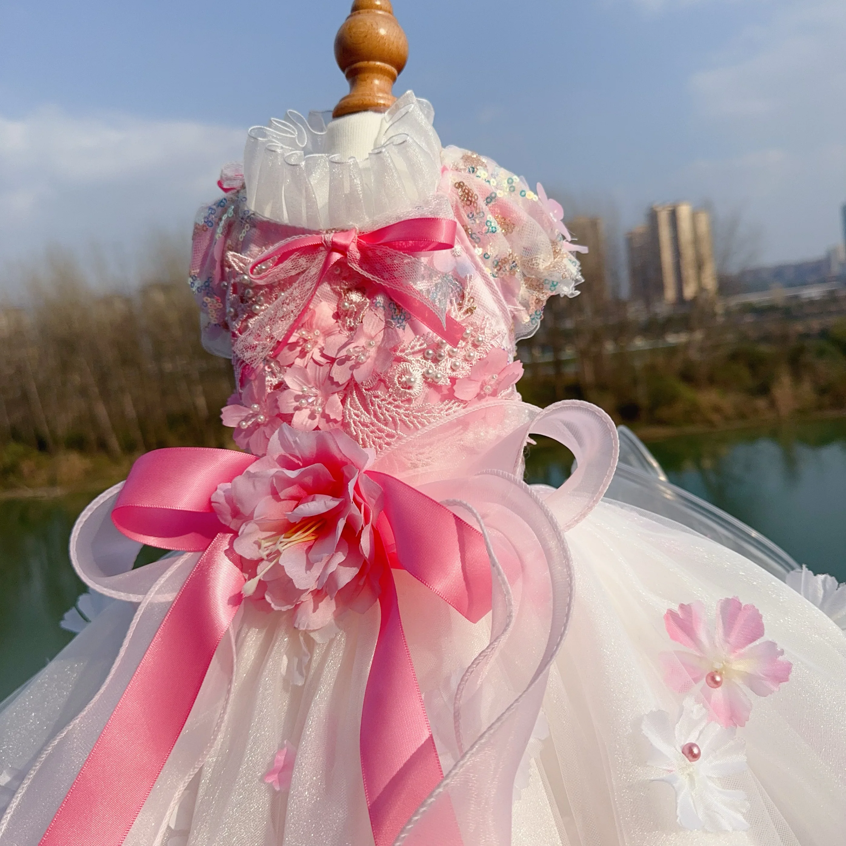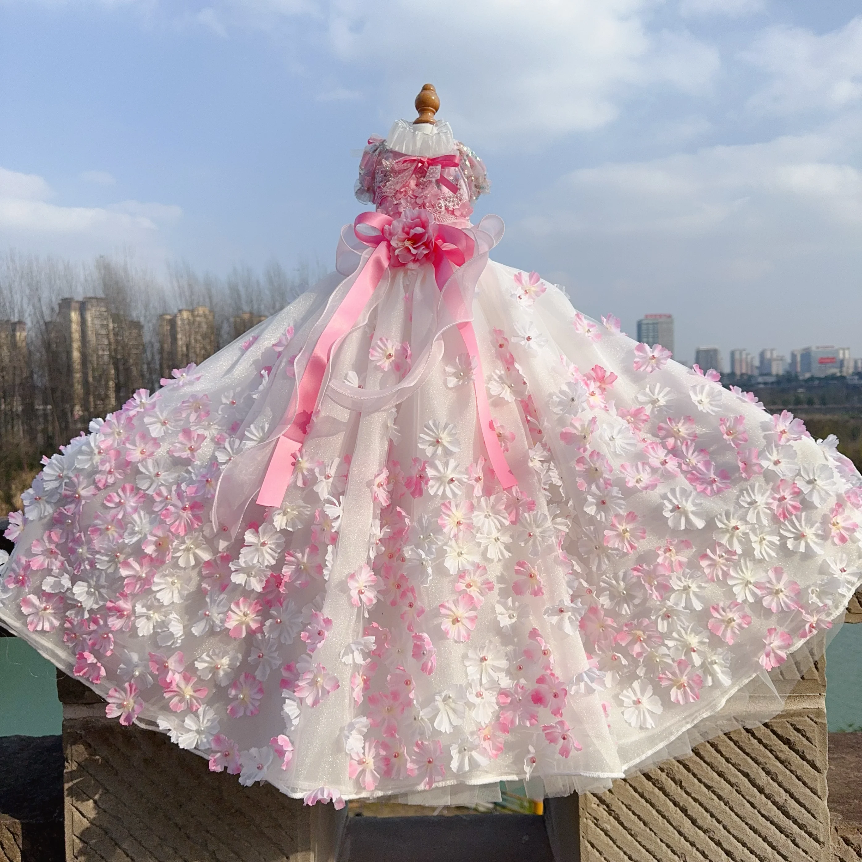 Pure Handmade Pet Dog Clothes Luxury Pearl Flower Decor Lace Long Tail Princess Dresses For Small Medium Dog Pink Skirts Puppy