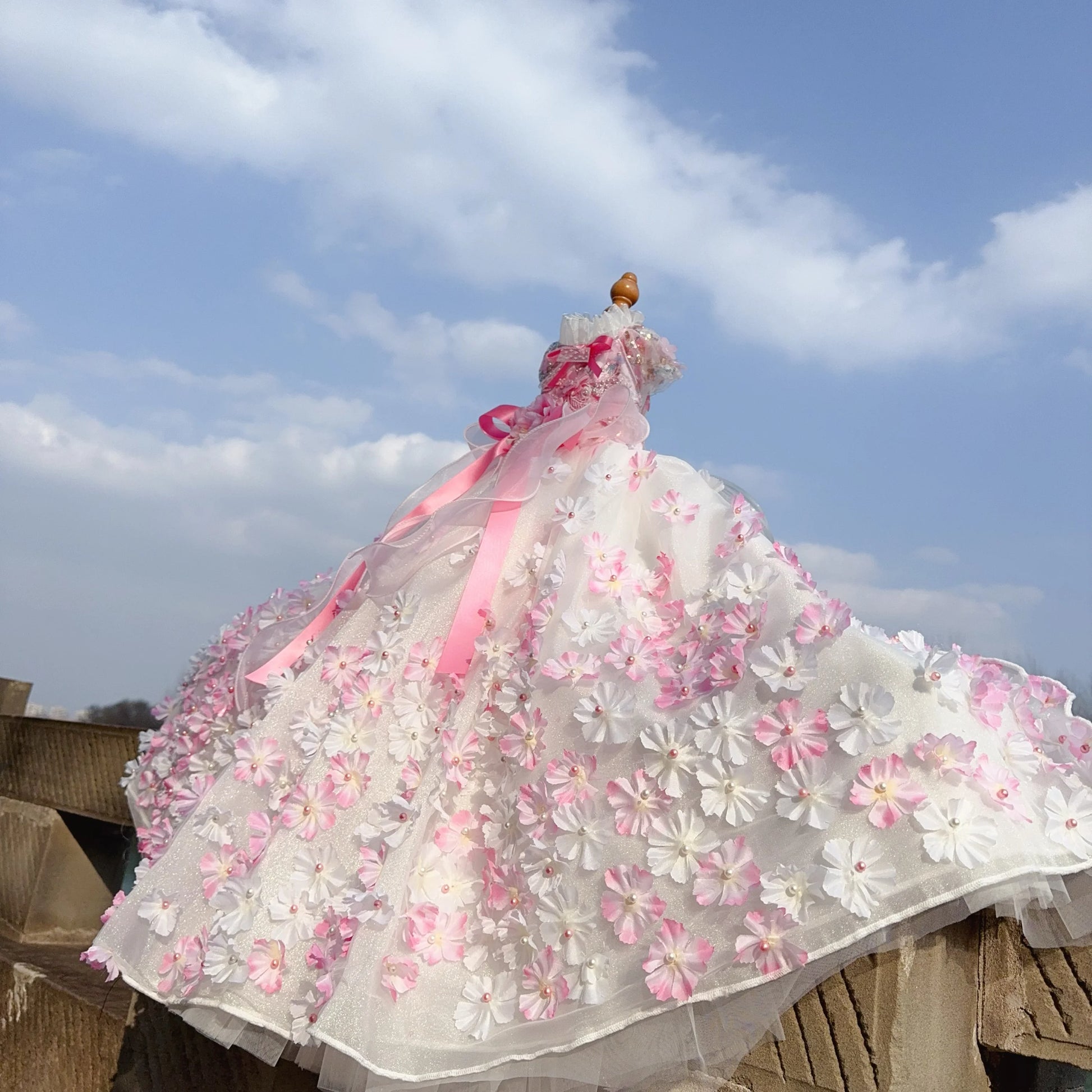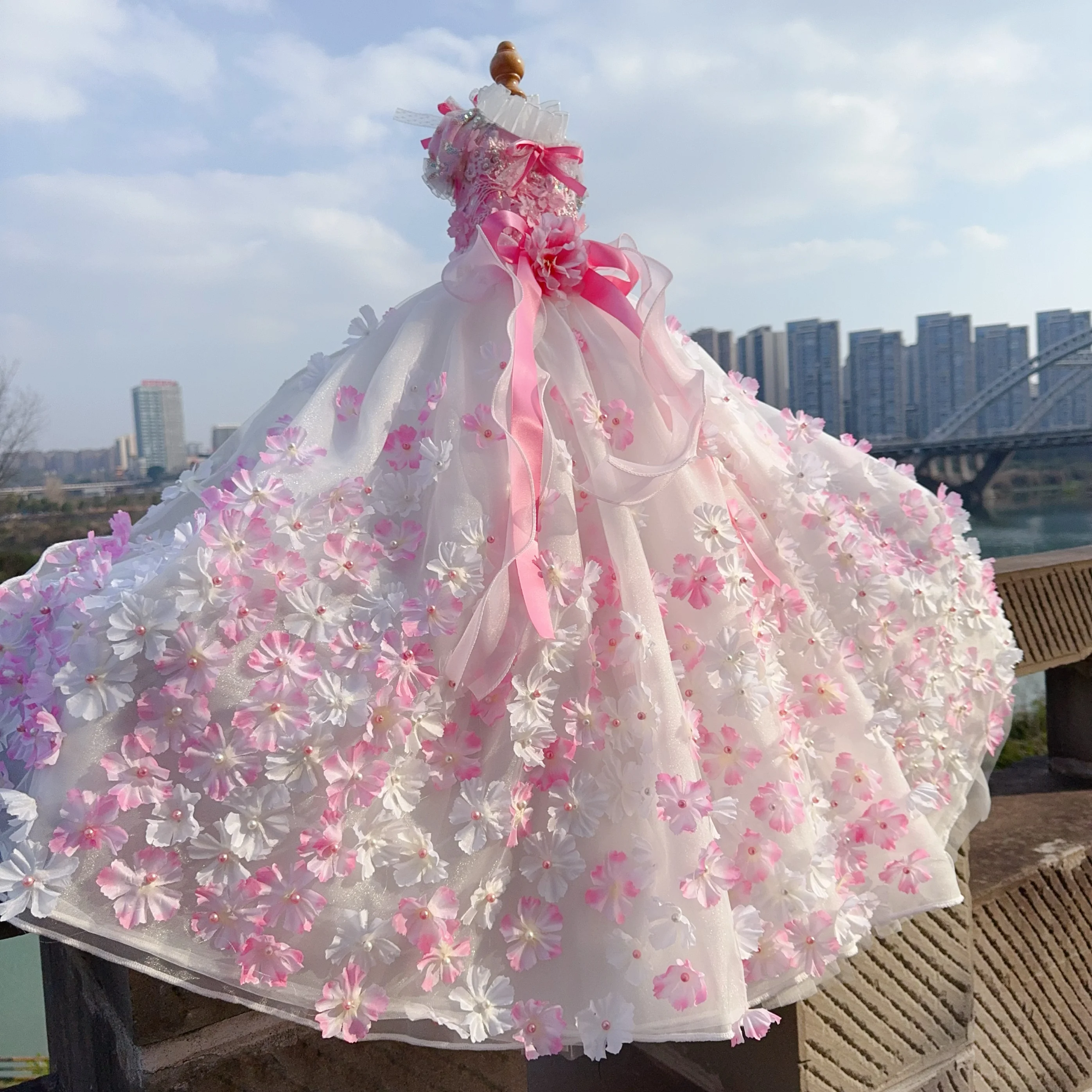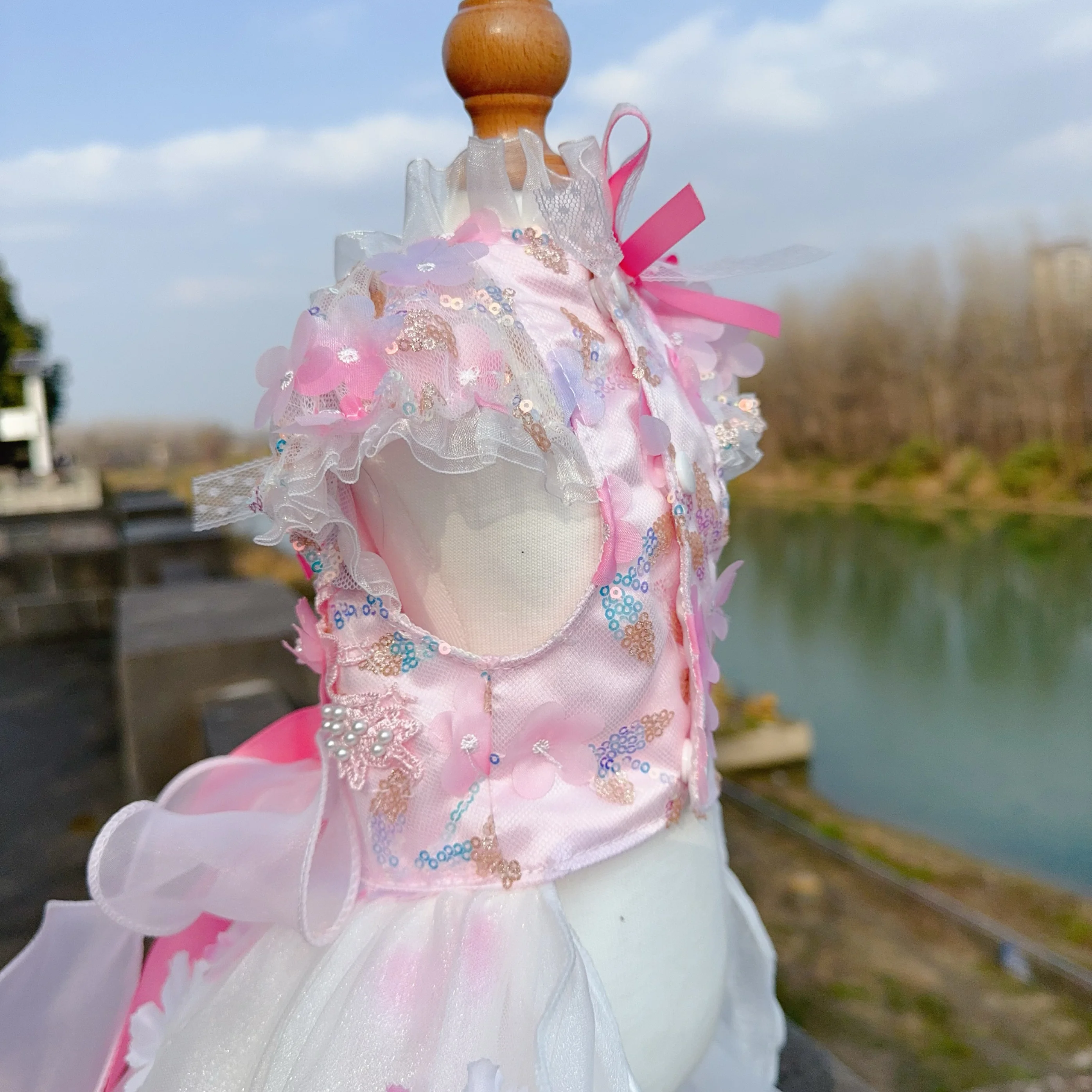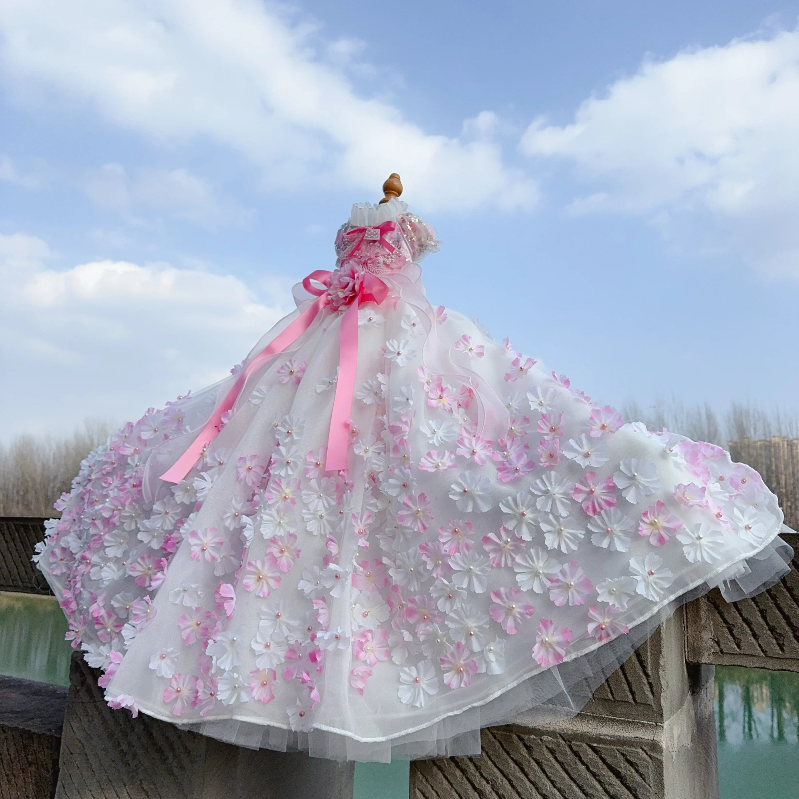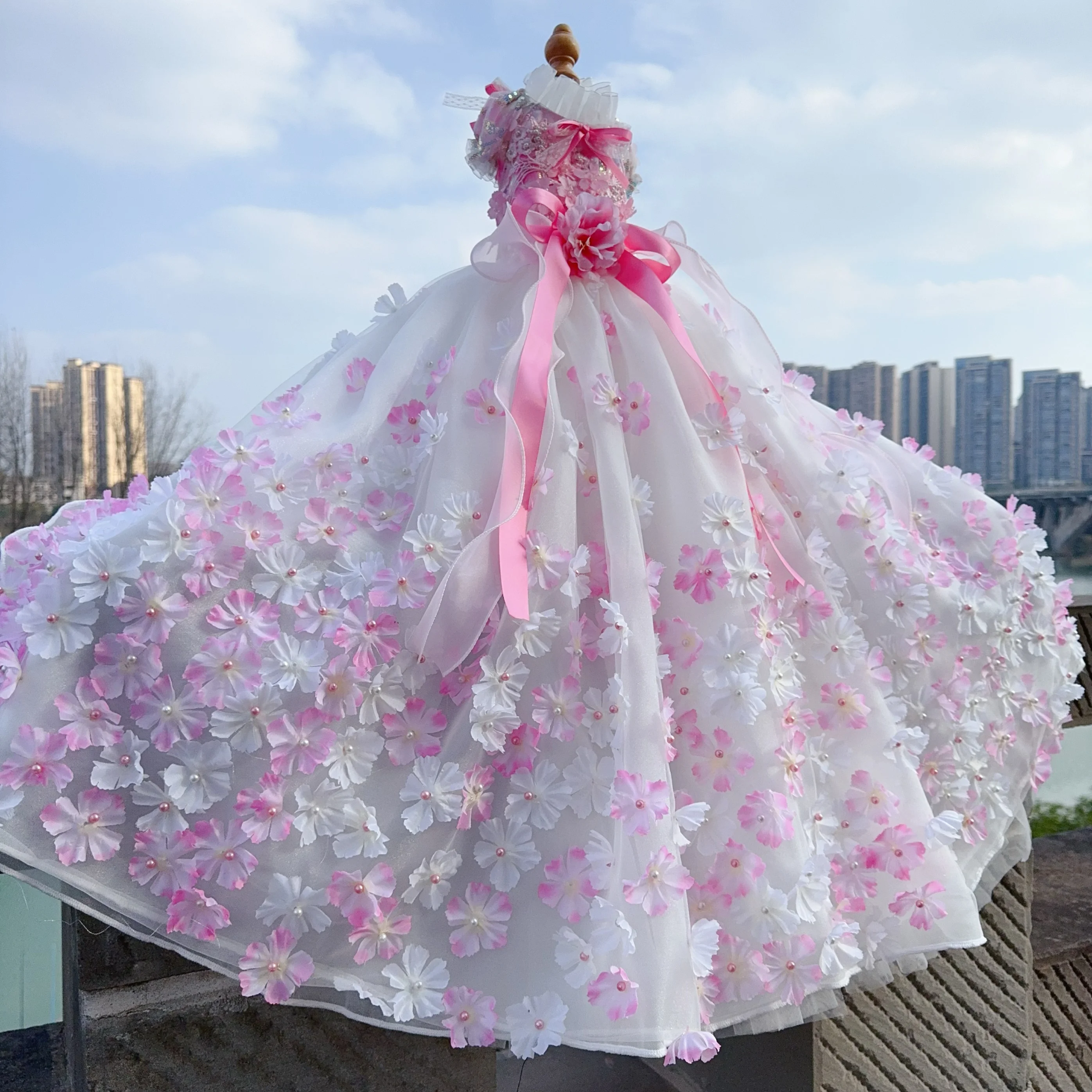Pure Handmade Pet Dog Clothes Luxury Pearl Flower Decor Lace Long Tail Princess Dresses For Small Medium Dog Pink Skirts Puppy