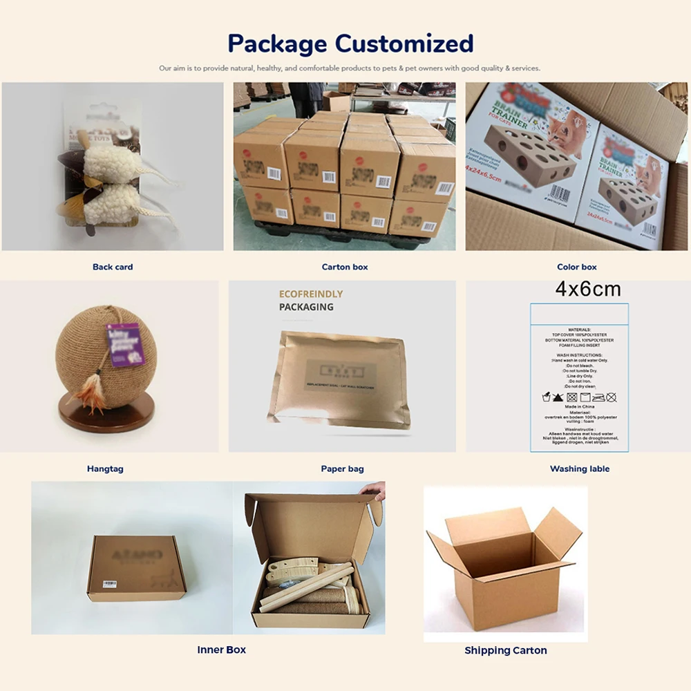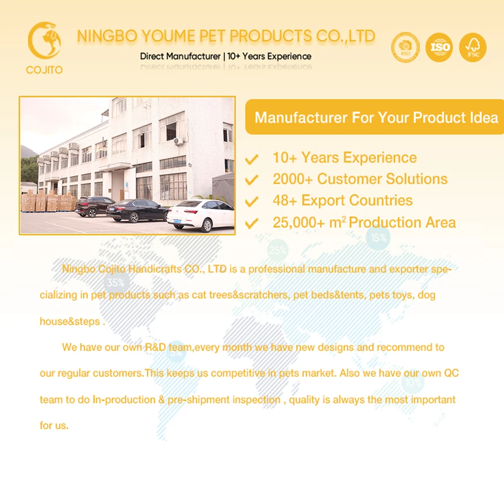 1. Are you manufacturer or trade company? ---We are direct manufacturer and have more than 10 years experience in pet products(Cat Trees, Scratching Posts, Pet Toys, etc..). 2.How can we guarantee quality? ---Always a pre-production sample before mass production. ---Always final Inspection before shipment. 3.Do you provide samples? Is it free or extra? ---Yes, we provide samples. It is not free, you need to pay sample fee and freight. But the charge will be deducted from your bulk order. 4. How long we can get the samples? How long about the delivery time? ---Samples time: 7-10 days. ---Delivery time: 30-45 days. 5.What payment terms you accept? ---For samples:Alibaba trade assurance are welcome. You may use your Credit card, it's convenience. ---For mass production: Alibaba trade assurance, T/T 30% deposit before mass production 6. What services do you provide? ---OEM/ODM Service. We have professional design team to help you do product design. ---Creatively Problem-solve. We thrive on solving problems for our customers and make it a central part of our support role . ---Respond Quickly. For good customer service, we will try to return all phone calls and emails within 6 hours. ---Best Freight and Logistics Cost Savings. Saving your money!